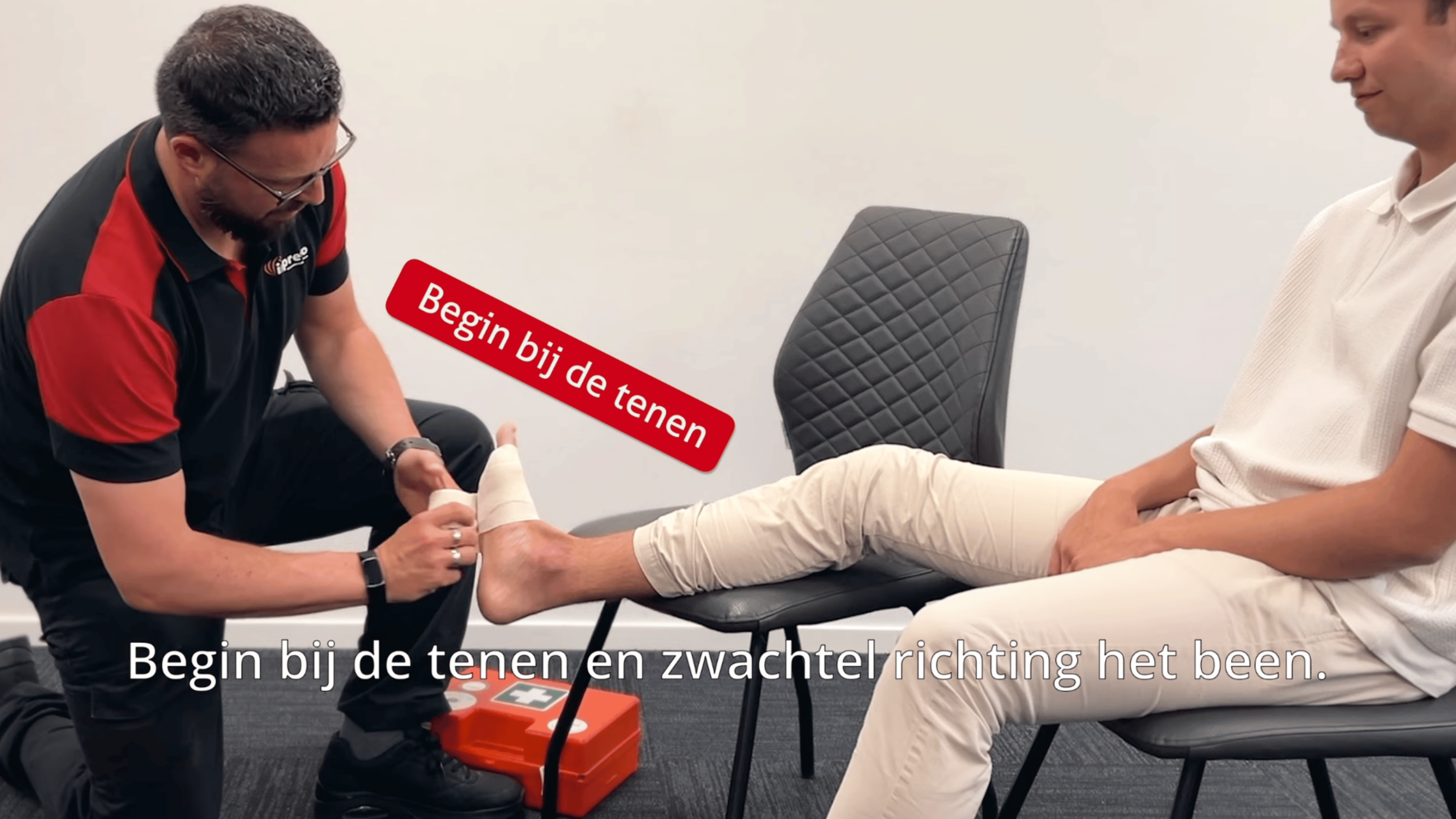 Een misstap is zo gemaakt. In één minuut laat Jouri zien hoe je een verstuikte enkel herkent, behandelt en verdere zwelling voorkomt.